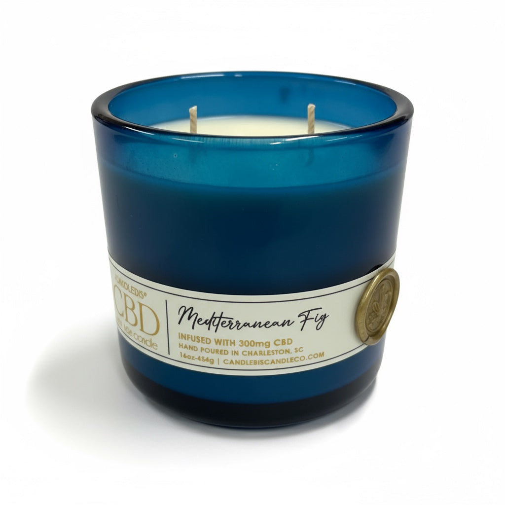 Crafted in a rich blue glass vessel with a black bamboo lid, this 16 oz candle features two wicks for a clean, even burn and is infused with 300mg of pure CBD to enhance relaxation and balance. Simple, natural, and effortlessly refined.