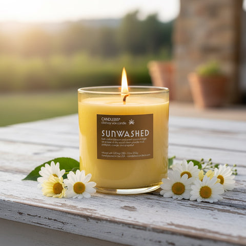 Say hello to pure relaxation with our CBD-infused Sunwashed candle, your go-to for capturing the essence of summer. Imagine the feeling of a gentle breeze on a warm day—this carefree fragrance opens with a trio of citrus top notes: petitgrain, orange, and grapefruit, like sunbeams inviting you to bask in the moment. The heart notes of fresh cotton blossom and sweet coconut evoke the comfort of freshly laundered linens swaying in the breeze, while a base of musk, wood, and powder adds depth and sophistication.