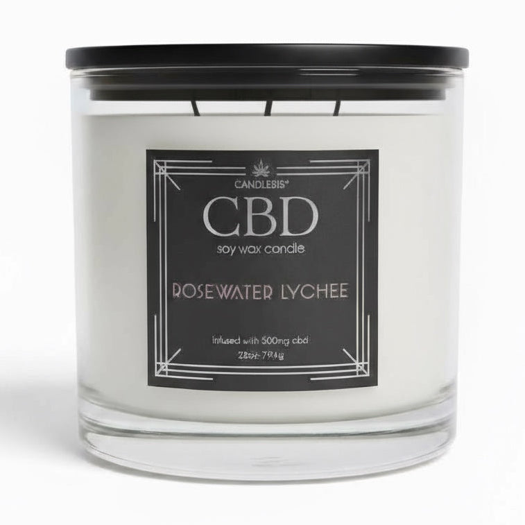 Discover our largest candle yet—the 28oz Rosewater Lychee CBD Candle. Infused with 500mg of CBD and featuring three luxurious wicks, it’s designed to provide a radiant, even burn that enhances your space with both beauty and aroma.