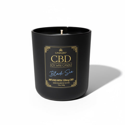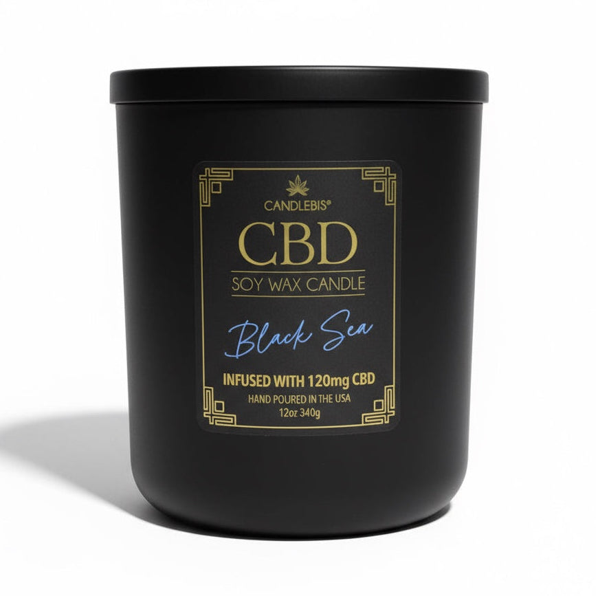 Candlebis elegant new black matte jar with black lid and matte black label with gold accents. Candlebis candles are CBD infused and made from natural soy wax and essential oils.